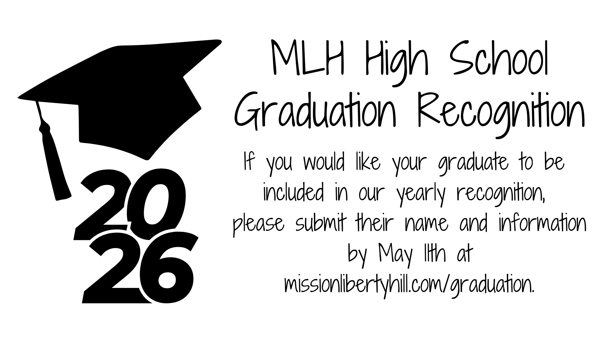 We would like to recognize our students graduating from high school. If you would like to submit names for recognition, please fill out the form below. Please submit this form by Sunday, May 11th. Please also email a baby picture and graduate picture to office@missionlibertyhill.com by May 11th.